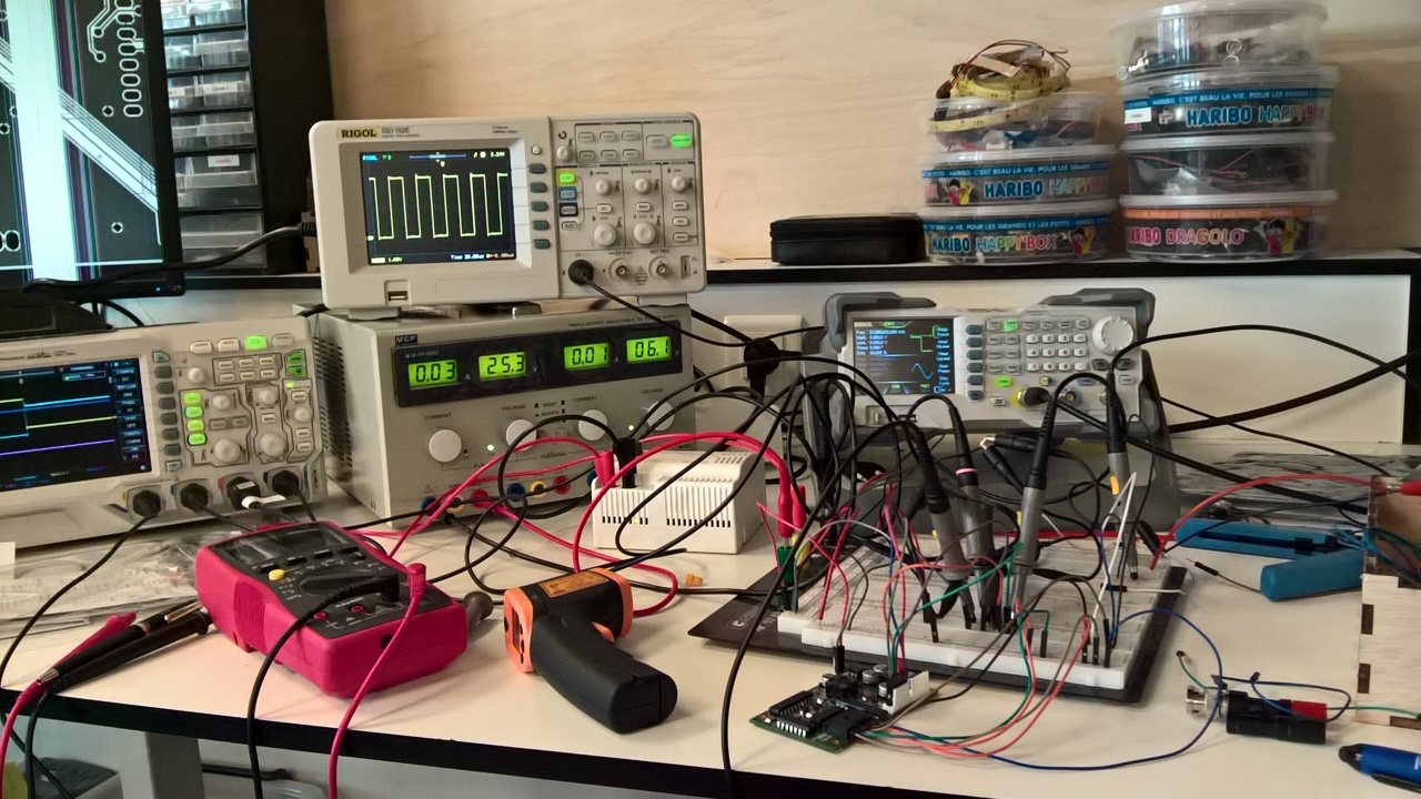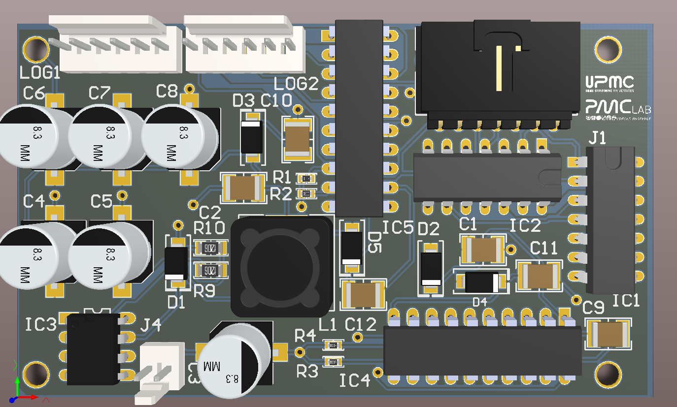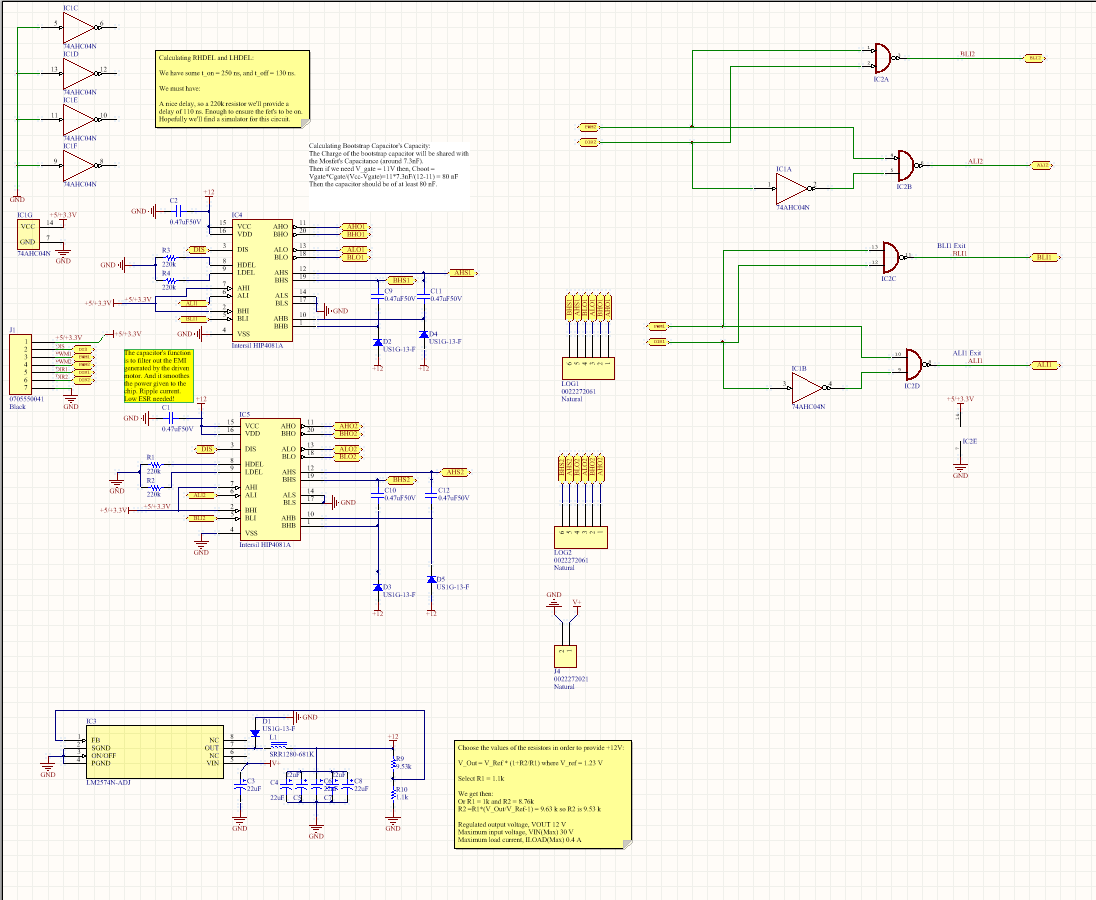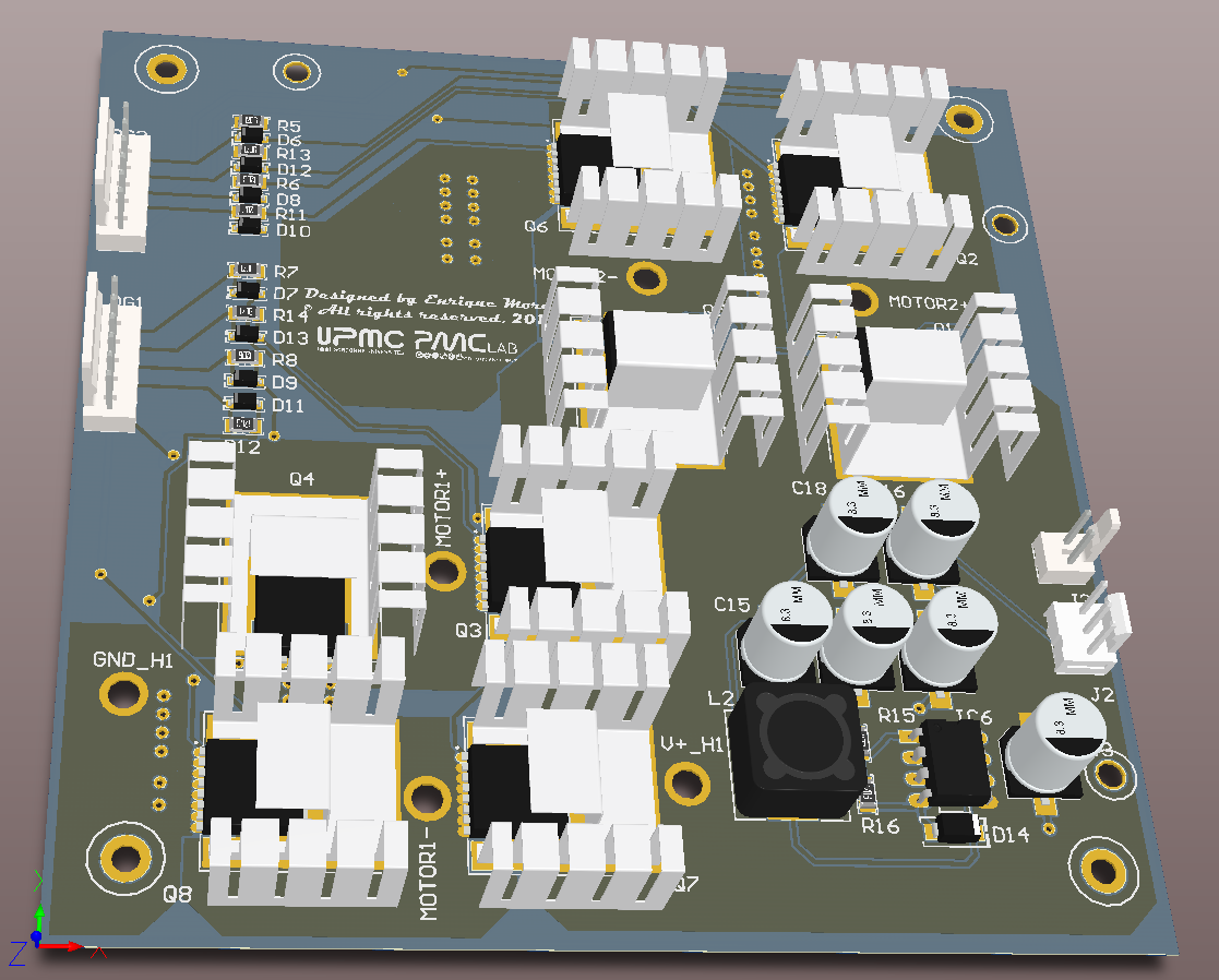 • *Porteur du projet: Enrique Morell (contact: emorell96@hotmail.com) Date de début : Décembre/2016. L'objectif est de créer un contrôleur moteur capable de contrôler deux moteurs de haute puissance à un coût réduit. Je me suis rendu compte de ce besoin lors du projet robot où on a pris des moteurs de haute puissance d'une perceuse pouvant atteindre 70A au blocage! Or trouver un contrôleur moteur pouvant résister ce courant peut très facilement devenir très coûteux. Et des fois on paye pour des caractéristiques qu'on n'utilise pas. Pour ces raison j'ai décidé de créer un contrôleur simplifié mais qui aurait toutes les caractéristiques essentielles pour résister des hauts courants. Le projet a initialement été conçu comme une seule carte étant capable de controller deux moteurs. Avec l'avancement du projet je me suis rendu compte que les puissance devront passer par la carte seront trop élevées pour être dissipé de manière simple sur une seule carte. J'ai décidé de rendre le projet modulaire. C'est à dire à séparer la carte en deux: * Une partie pour la logique digitale, i.e. la partie chargée de “comprendre” l'arduino ou raspberry pi * Et une partie pour la haute puissance qui contiendra le pont H et qui chauffera et sera refroidit indépendamment de la carte logique. ====== Cahier des charges: ====== *Pont H à 2 voies, i.e., peut contrôler 2 moteurs. *Voltage batterie: 13 V - 30 V *Courant continu maxi: 60A-80A *N-channel mosfets pour maximiser l'efficience. *Utilisable avec l'Arduino Uno, i.e. 2 entrées par moteur: 1 PWM et un DIR High ou LOW pour le sens de rotation, et raspberry pi. ====== Machines nécessaires ====== *CIF *Et poste à souder. ====== Matériels nécessaires ====== ===== Divers ===== *Breadboard *Oscilloscope *GBF *Alimentation Stabilisée (fait pour batterie) ===== Electronique (cette liste évolue) ===== *4 diodes UF1002 ou UF1007. *2 HIP4081A (contrôleur mosfet full bridge) *8 MOSFET IRF3205 (référence peut changer si ses caractéristiques ne sont pas suffisantes pour atteindre les valeurs du cahier de charges) *LM2574-12 ou LM2574-ADJ régulateur de voltage à switch (plus efficace qu'un régulateur linéaire) ====== Bibliographie ====== Secrets des Ponts H de Modular Circuits (lecture recommandée si vous ne connaissiez pas les pont H en détail) http://www.modularcircuits.com/blog/articles/h-bridge-secrets/ Projet guide Open Source Motor Controller: http://www.robotpower.com/products/osmc_info.html ====== Schématique provisoire ====== Modifié le 11/09/2017 Schéma électrique de la partie haute puissance: Schéma électrique de la partie logique: Board finie: Nouveau Board: https://1drv.ms/b/s!AljDQF12JgJdj_NHzgXzwMWCGWuCiw en fichier pdf 3D. Partie Logique: Partie Haute Puissance: ===== Choix de Resistances pour le LM2574N ADJ ===== VOUT = VREF (1+R2/R1) où VREF = 1.23 V (voir datasheet) et VOUT = 12 V D'où R2 = R1*(VOUT/VREF -1). On fixe R1 = 1 kOhm, on a donc R2=8.76 kOhm. ===== Carnet de bord ===== 28 Novembre: Début du projet. Je décide de commencer ce projet avec le but de créer un contrôleur moteur respectant les charges du cahier de charges. Pour ceci il faut avant tout s'informer. Je suis occupé donc à lire la bibliographie. 1 Décembre 2016: Ayant déjà les mosfets (IRF3205) j'ai vérifié que les valeurs caractéristiques vérifient les valeurs nécessaires aux cahier de charges. Début de la création du .sch par le pont H. 6 Décembre 2016: Le schéma est fini (sauf éventuelles modification suivant le conseil de membres plus expérimentés) (Voir rubrique “Schema provisoire”) Fin juin 2017: Nouveau design fini (voir fichier pdf en ligne). Commande de la partie logique faite aussi. On reçoit la partie logique: Après avoir installé les composants à la main (sans utiliser le four à SMD) (SMD = Surface Mounted Devices = CMS en français): La partie logique à été testé: On lui donne un signal PWM en utilisant un générateur de tension (lui il simule un arduino ou raspberry Pi): Et on regarde que les sorties soient correct pour contrôler les MOSFETs qui copieront le signal PWM au moteurs: Les signaux sont copiés fidelement. Et dans l'image suivante on observe qu'on n'a pas de shoot through (voir bibliographie)(AHO et ALO ne sont jamais allumé en même temps: voir schema du pont H): Juillet et Août: Vacances d'été donc pas d'avancement. 9 septembre 2017: Commande de la partie haute puissance. Le 25/26 Septembre 2017 on devrait le recevoir. Projet en attente. Semaine du 25 septembre 2017: Soudage de la nouvelle pièce et premiers tests. Le channel 2 est fonctionnel hors le channel 1 a deux mosfets morts qui ont étés enlevés. On attendant les nouveaux mosfets on prepare une petite boite pour le projet en bois mdf 3mm. Semaine du 02 Octobre 2017: On rajoute une diode TVS et deux capacités bypass pour filtrer les piques de voltages générés par les moteurs. On rajoutera aussi des diodes TVS entre Source et Drain de chaque mosfet pour campler le voltage Vds. ====== Licence de ce projet: ====== https://creativecommons.org/licenses/by-nc-sa/4.0/