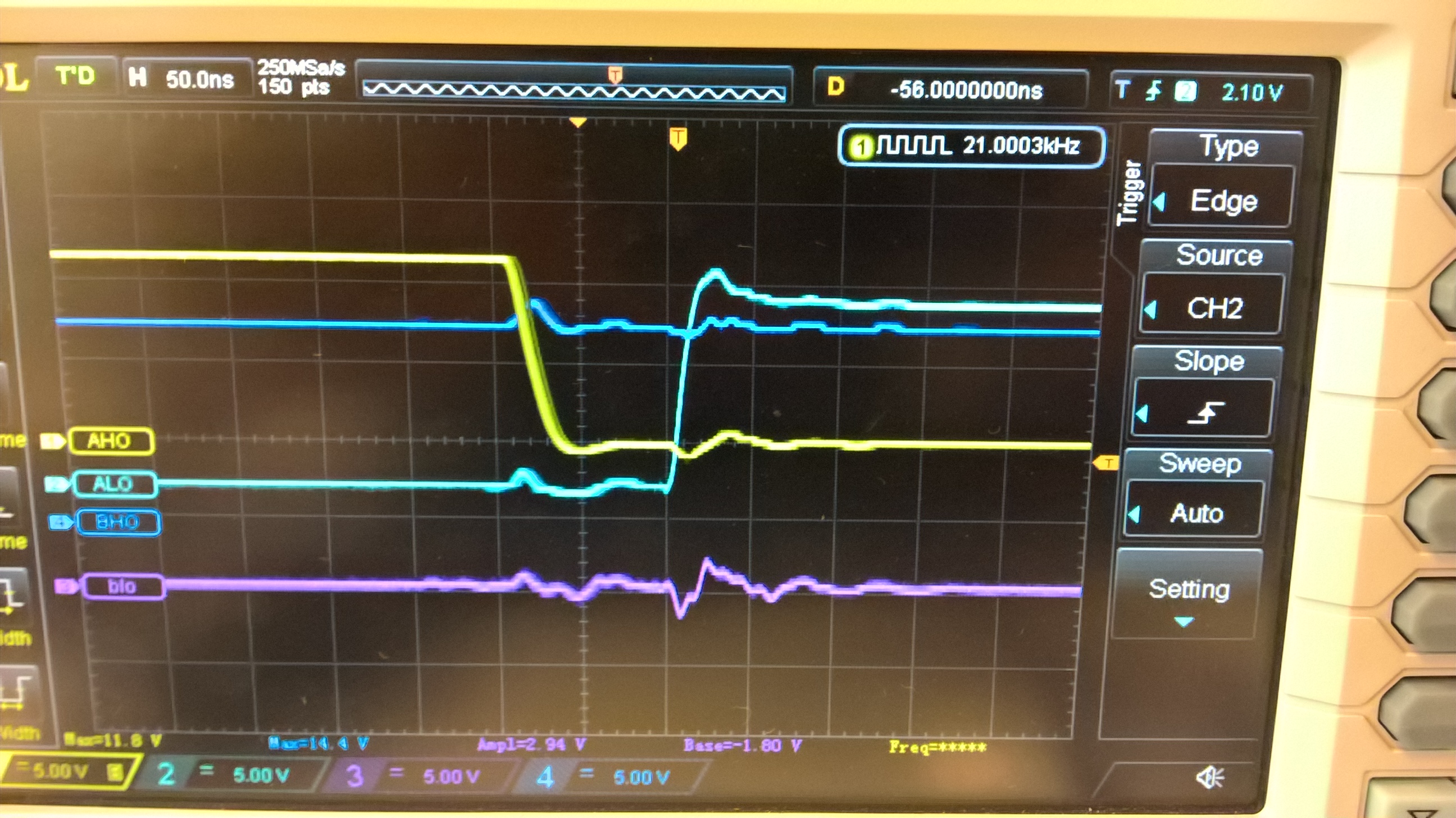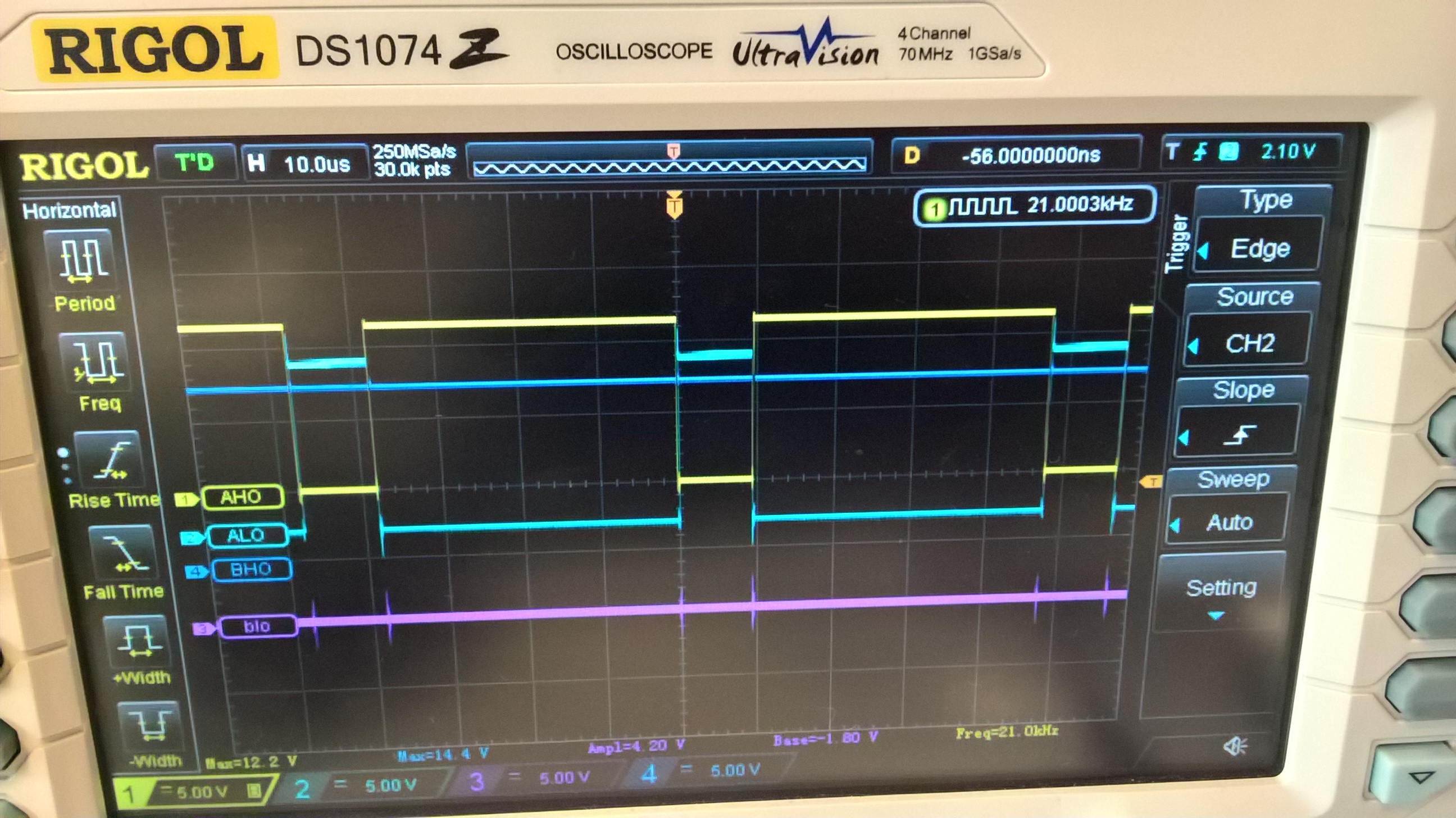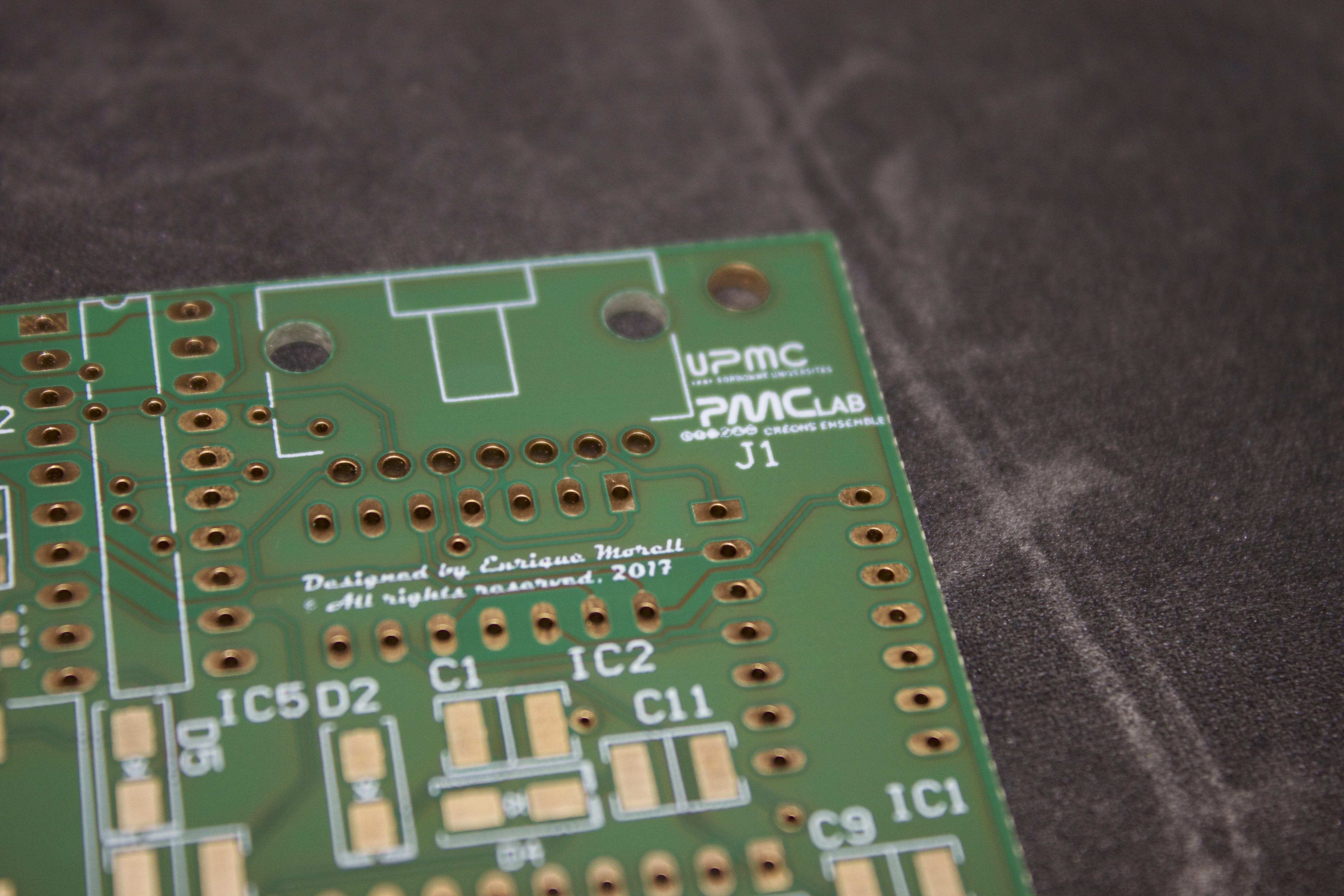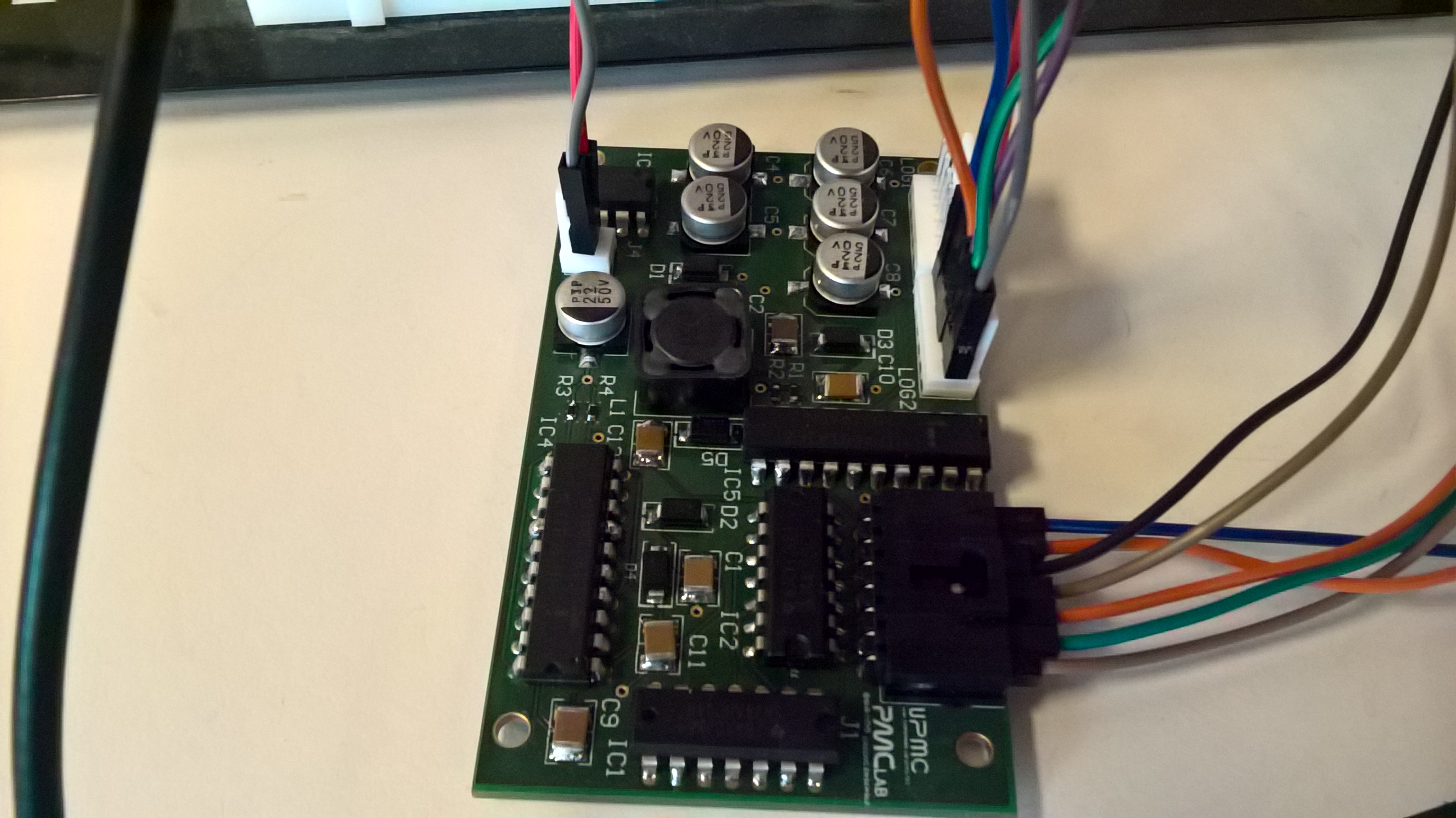 • *Porteur du projet: Enrique Morell (contact: emorell96@hotmail.com) Date de début : Décembre/2016. L'objectif est de créer un contrôleur moteur capable de contrôler deux moteurs de haute puissance à un coût réduit. Je me suis rendu compte de ce besoin lors du projet robot où on a pris des moteurs de haute puissance d'une perceuse pouvant atteindre 70A au blocage! Or trouver un contrôleur moteur pouvant résister ce courant peut très facilement devenir très coûteux. Et des fois on paye pour des caractéristiques qu'on n'utilise pas. Pour ces raison j'ai décidé de créer un contrôleur simplifié mais qui aurait toutes les caractéristiques essentielles pour résister des hauts courants. Le projet a initialement été conçu comme une seule carte étant capable de controller deux moteurs. Avec l'avancement du projet je me suis rendu compte que les puissance devront passer par la carte seront trop élevées pour être dissipé de manière simple sur une seule carte. J'ai décidé de rendre le projet modulaire. C'est à dire à séparer la carte en deux: * Une partie pour la logique digitale, i.e. la partie chargée de “comprendre” l'arduino ou raspberry pi * Et une partie pour la haute puissance qui contiendra le pont H et qui chauffera et sera refroidit indépendamment de la carte logique. ====== Cahier des charges: ====== *Pont H à 2 voies, i.e., peut contrôler 2 moteurs. *Voltage batterie: 13 V - 30 V *Courant continu maxi: 60A-80A *N-channel mosfets pour maximiser l'efficience. *Utilisable avec l'Arduino Uno, i.e. 2 entrées par moteur: 1 PWM et un DIR High ou LOW pour le sens de rotation, et raspberry pi. ====== Machines nécessaires ====== *CIF *Et poste à souder. ====== Matériels nécessaires ====== ===== Divers ===== *Breadboard *Oscilloscope *GBF *Alimentation Stabilisée (fait pour batterie) ===== Electronique (cette liste évolue) ===== *4 diodes UF1002 ou UF1007. *2 HIP4081A (contrôleur mosfet full bridge) *8 MOSFET IRF3205 (référence peut changer si ses caractéristiques ne sont pas suffisantes pour atteindre les valeurs du cahier de charges) *LM2574-12 ou LM2574-ADJ régulateur de voltage à switch (plus efficace qu'un régulateur linéaire) ====== Bibliographie ====== Secrets des Ponts H de Modular Circuits (lecture recommandée si vous ne connaissiez pas les pont H en détail) http://www.modularcircuits.com/blog/articles/h-bridge-secrets/ Projet guide Open Source Motor Controller: http://www.robotpower.com/products/osmc_info.html ====== Schématique provisoire ====== Modifié le 11/09/2017 Schéma électrique de la partie haute puissance: Schéma électrique de la partie logique: Board finie: Nouveau Board: https://1drv.ms/b/s!AljDQF12JgJdj_NHzgXzwMWCGWuCiw en fichier pdf 3D. Partie Logique: Partie Haute Puissance: ===== Choix de Resistances pour le LM2574N ADJ ===== VOUT = VREF (1+R2/R1) où VREF = 1.23 V (voir datasheet) et VOUT = 12 V D'où R2 = R1*(VOUT/VREF -1). On fixe R1 = 1 kOhm, on a donc R2=8.76 kOhm. ===== Carnet de bord ===== 28 Novembre: Début du projet. Je décide de commencer ce projet avec le but de créer un contrôleur moteur respectant les charges du cahier de charges. Pour ceci il faut avant tout s'informer. Je suis occupé donc à lire la bibliographie. 1 Décembre 2016: Ayant déjà les mosfets (IRF3205) j'ai vérifié que les valeurs caractéristiques vérifient les valeurs nécessaires aux cahier de charges. Début de la création du .sch par le pont H. 6 Décembre 2016: Le schéma est fini (sauf éventuelles modification suivant le conseil de membres plus expérimentés) (Voir rubrique “Schema provisoire”) Fin juin 2017: Nouveau design fini (voir fichier pdf en ligne). Commande de la partie logique faite aussi. On reçoit la partie logique: Après avoir installé les composants à la main (sans utiliser le four à SMD) (SMD = Surface Mounted Devices = CMS en français): La partie logique à été testé: On lui donne un signal PWM en utilisant un générateur de tension (lui il simule un arduino ou raspberry Pi): Et on regarde que les sorties soient correct pour contrôler les MOSFETs qui copieront le signal PWM au moteurs: Les signaux sont copiés fidelement. Et dans l'image suivante on observe qu'on n'a pas de shoot through (voir bibliographie)(AHO et ALO ne sont jamais allumé en même temps: voir schema du pont H): Juillet et Août: Vacances d'été donc pas d'avancement. 9 septembre 2017: Commande de la partie haute puissance. Le 25/26 Septembre 2017 on devrait le recevoir. Projet en attente. Semaine du 25 septembre 2017: Soudage de la nouvelle pièce et premiers tests. Le channel 2 est fonctionnel hors le channel 1 a deux mosfets morts qui ont étés enlevés. On attendant les nouveaux mosfets on prepare une petite boite pour le projet en bois mdf 3mm. Semaine du 02 Octobre 2017: On rajoute une diode TVS et deux capacités bypass pour filtrer les piques de voltages générés par les moteurs. On rajoutera aussi des diodes TVS entre Source et Drain de chaque mosfet pour campler le voltage Vds. ====== Licence de ce projet: ====== https://creativecommons.org/licenses/by-nc-sa/4.0/