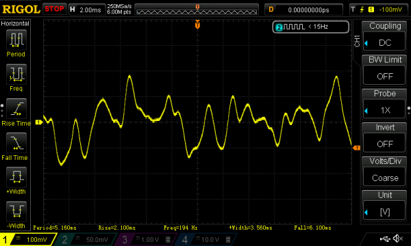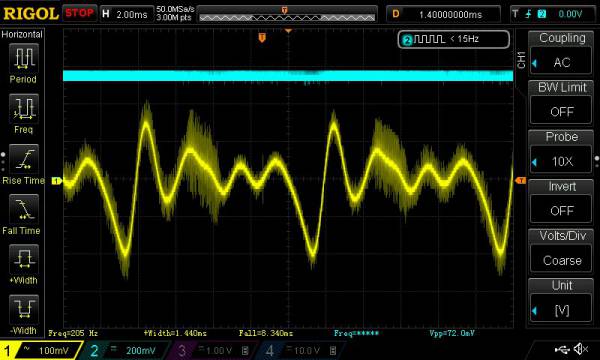 le signal sortant à une amplitude d'environ $400mV$ peak to peak. Ici, toutes les cordes ont été joués en même temps, ce qui donne cette forme assez particulière.