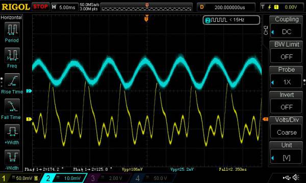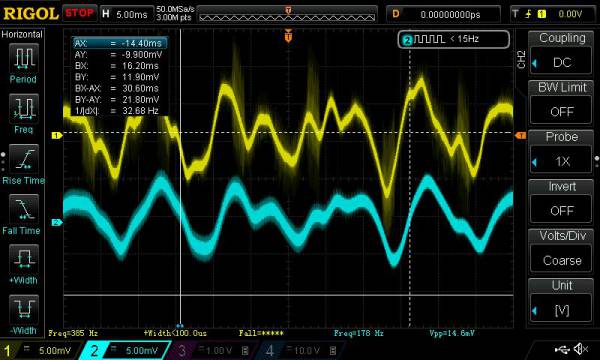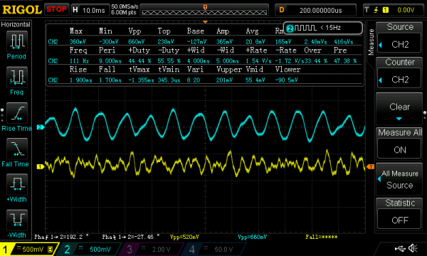 On a eu quelques soucis de mesure, cela était du à notre câble jack (doù le fait qu'on est un signal très faible en entrée). On l'a donc remplacé pour la suite et tout fonctionne bien.