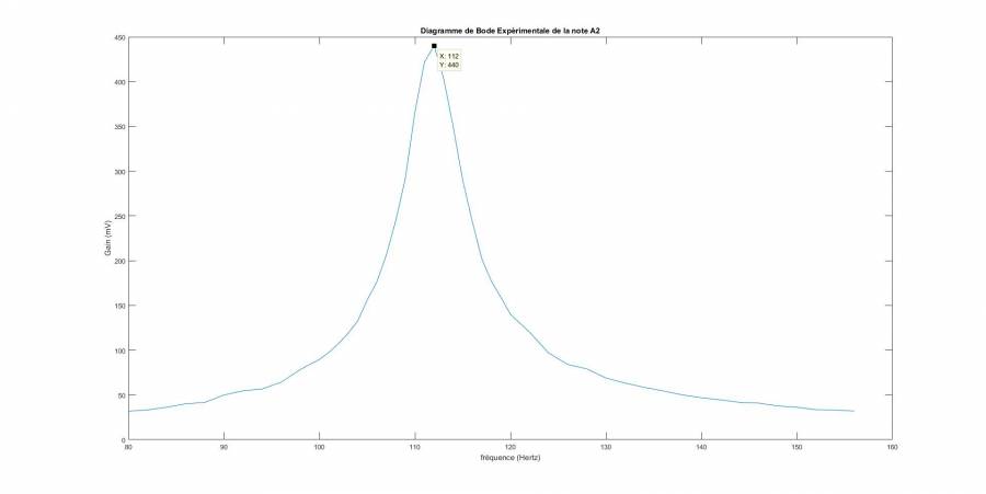 Nous avons réaliser le filtre permettant d'isoler la fréquence de la $5^{ème}$ corde $f_{La}=110H_z$.