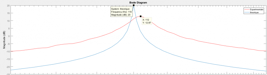 En effet, un peu plus haut j'ai évoqué le fait que l'on utilisait des potentiomètres, avec le temps ils se sont déréglé et la fréquence de coupure à changer et est de $f_c\approx 105H_z$.