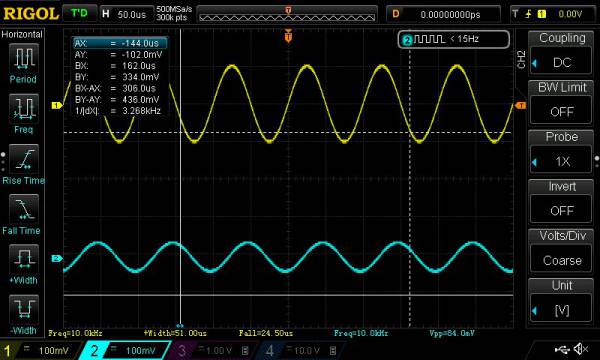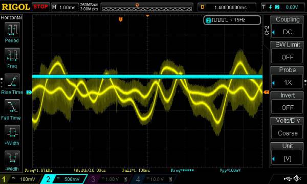 Sur les graphiques d'oscilloscope, il y aura parfois deux signaux de couleur différente. Le signal en Jaune correspond à notre l'entrée et celui en bleu la sortie