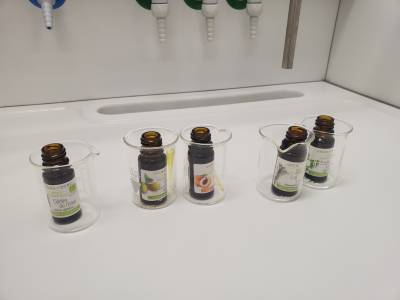 A l'aide d'une micropipette de 100µL et des pointes adaptées, nous avons disposé les vials d'huiles essentielles dans des béchers et mis pour chaque une pointe dans le bécher. Dans un pillulier, nous avons ajouté à tâtons des quantités variables de chacune des huiles essentielles et extraits aromatiques (citron, pêche, cèdre, basilic, romarin) jusqu'à obtenir un mélange plaisant à sentir. Nous avons bien noté les quantités ajoutées afin de reproduire ce mélange et obtenir une grande quantité de concentré de parfum.