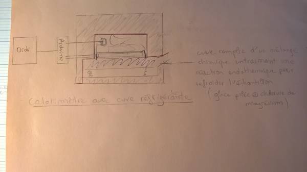 Finalement, nous avons décidé que notre calorimètre sera plus automatisée qu'un calorimètre classique. Notre objectif est de construire un appareil capable de -faire un suivi de la température -élever/réduire la température -connaitre la quantité de chaleur apportée à l'enceinte -réguler sa température (système de refroidissement) -isoler l'enceinte des échanges de chaleur avec l'extérieur.