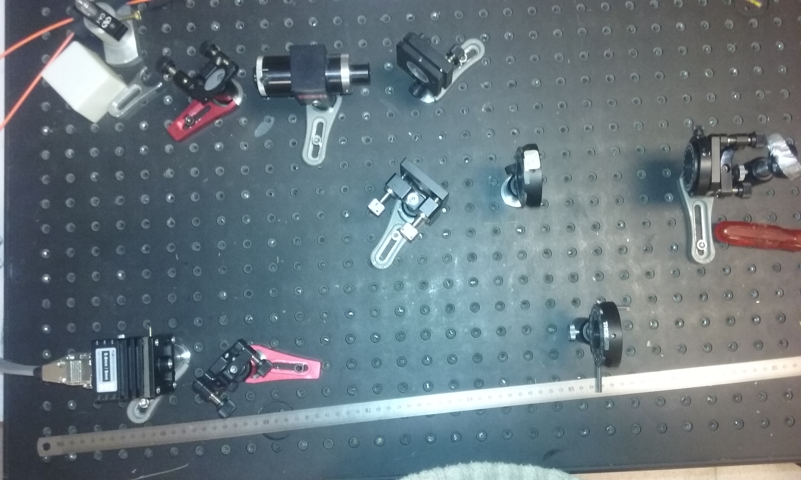 Nous commençons par coupler une fibre dans un coin de la table afin de pouvoir s'en servir plus tard. Des problèmes de lentille nous ralentissent un peu mais, finalement, nous y arrivons.