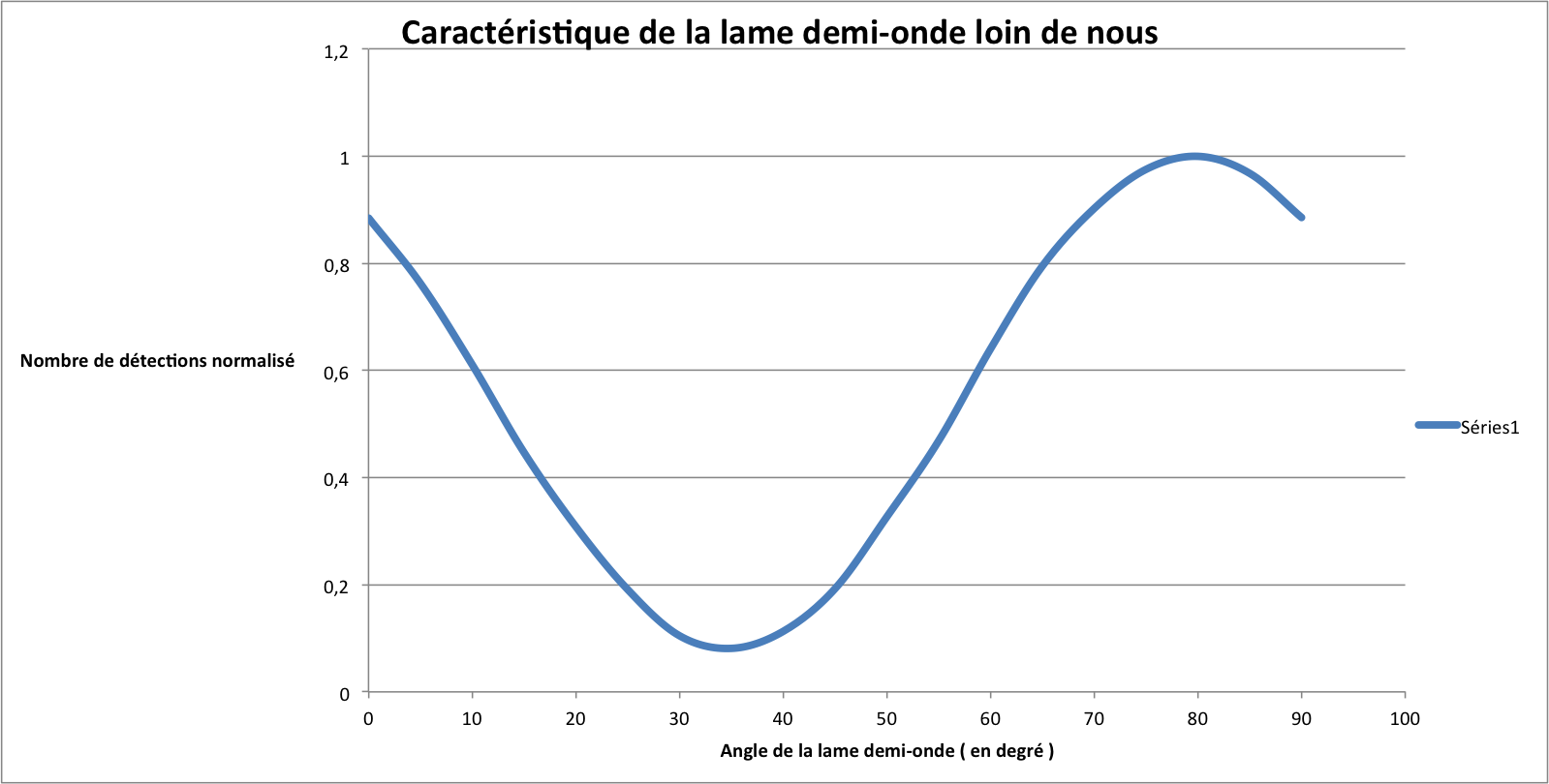 Interprétons ces résultats : pour la première lame, tout d'abord, on observe un maximum de détections autour de 60° ( en fait, 58° ). Sachant que les photons qui arrivent sur la lame sont verticaux, et que l'on a un cube PBS qui ne laisse passer dans la fibre qu'une polarisation horizontale, cela signifie que lorsque cette lame est orientée à 58°, elle transforme une polarisation verticale en polarisation horizontale. Elle laisse donc passer une polarisation verticale et on appellera donc cet axe l'axe vertical. A contrario, l'axe horizontal est tel qu'il laisse passer une polarisation horizontale, et donc tel qu'il ne laisse pas passer une polarisation verticale. C'est donc l'angle tel qu'on ait un minimum ( ici, 12° ). De même pour la seconde lame, l'axe vertical est à 81° et l'axe horizontal à 36°. On remarque tout d'abord qu'entre les deux axes d'une lame, on a bien un angle de 45°. Cela est cohérent car on sait qu'une lame demi-onde modifie la polarisation d'un angle égal au double de son angle par rapport à son axe. Entre une polarisation verticale et horizontale, on a 90°, il est donc logique d'avoir 45° entre les deux axes. Plus globalement, on observe bien des courbes en cos^2, caractéristiques de la loi de Malus. Celle-ci est donc vérifiée lorsqu'on compte les photons de manière individuelle.