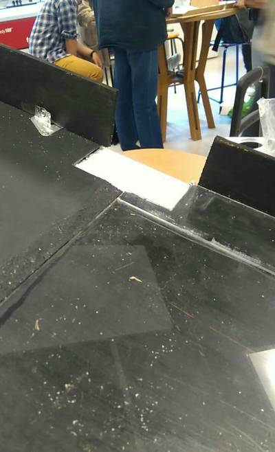 Résume du 03.05.2018**Nous avons fini de fixer les bordures du jeu, puis nous avons peint celui ci en noir et blanc afin que cela soit le plus esthétique possible et donne envie d'y jouer. Une nouvelle contrainte s'est présentée à nous cet après midi, l'une des partie du jeu était plus haute que les autres : le palet ne glissait pas. Nous avons donc décidé de créer une pente afin que les enfants puissent découvrir la physique du glissement sur terrain plat et en côte. Nous avons également créer les derniers palets : en plexiglas (PMMA) et en bois recouvert de tissus.