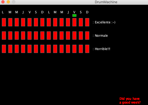 simple class for drawing the gui class Rect { int x, y, w, h; boolean[] steps; int stepId; public Rect(int _x, int _y, boolean[] _steps, int _id) { x = _x; y = _y; w = 21; h = 30; steps = _steps; stepId = _id; } public void draw() { if ( steps[stepId] ) { fill(0,255,0); } else { fill(255,0,0); } rect(x,y,w,h); textSize(90); text(“X”,700,70, width/10, height/2); } public void mousePressed() { if ( mouseX >= x && mouseX ⇐ x+w && mouseY >= y && mouseY ⇐ y+h ) { steps[stepId] = !steps[stepId]; } } } void setup() { size(800, 800); minim = new Minim(this); out = minim.getLineOut(); load all of our samples, using 4 voices for each.