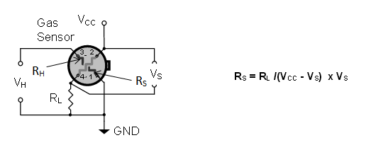 Un capteur de gaz est un élément constitué de différentes couches de semi conducteurs sensible à la présence de certains composés gazeux. De manière générale l'objectif est de mesurer la valeur de la résistance interne du capteur qui va varier selon le taux de gaz présent dans l'air. En réalisant un pont diviseur de tension il est possible d'obtenir la valeur de cette résistance sensible. Il est aussi possible de noter la présence d'une résistance de chauffage qui aura pour but de placer le capteur dans les conditions optimal pour les mesures.