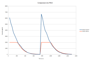 A l'aide du logiciel MiePlot, on peut connaître le coefficient d'atténuation $\frac{Pe}{Pr}$ pour une particule. Ainsi, connaissant la puissance émise et la puissance totale reçue, on peut déduire le nombre de particules présentes dans le détecteur par une simple division. Nous avons ainsi pu estimer (à vérifier), à partir de MiePlot, que l'intensité reçue était $10^8$ fois plus petite que l'intensité émise pour une particule. Ainsi, pour un grand nombre de particules (ex : $50*10^6$, cf test Shinyei), notre capteur devra être capable de détecter une intensité de l'ordre du $W.m^{-2}$ pour notre LED à 27$W.m^{-2}$.