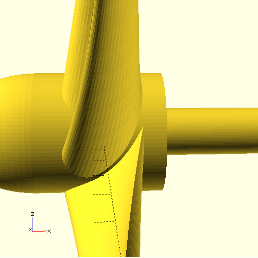 Ce logiciel fonctionne de manière paramétrique. Autrement-dit, la modélisation de l'objet désiré passe par une programmation et la rédaction d'un script dans une fenêtre affichant au fur et à la mesure le prototype 3D sur une seconde fenêtre. Le site internet de Thingiverse nous a permis de trouver des inspirations de modèles déjà présenter pour des turbines. Nous avons alors jouer sur les paramètres de la taille des pales (longueurs, largeur du moyeu, épaisseur…) ou encore sur l'angle d'attaque et la “torsion” de chaque pales.