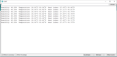 Après le Téléchargement de ce code sur notre carte ESP8266 et sélectionner la bonne carte et le bon port COM dans les paramètres de votre IDE Arduino ,on a réussi a afficher les valeurs de température et humidité :