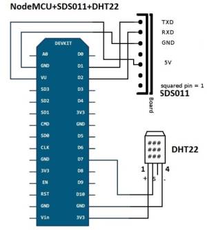 Voici le schéma de montage qui montre le dos du NodeMcu ,le dos du SDS011 et la face du DHT22