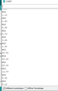 Apres le règlement de problème de la bibliothèque nous avons réussi d'afficher les valeurs de NO2 , mais sont élevées comme vous voyer sur le moniteur série