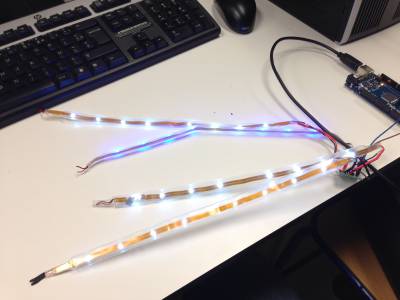 Nous avons tout d'abord alimenté les leds avec un Arduino. Nous avons fait ceci pour deux raison. La première, l'Arduino ne délivre pas un grand courant. Deuxièmement, l'Alim était dans l'armoire et l'Arduino sur la table (La flème de se lever