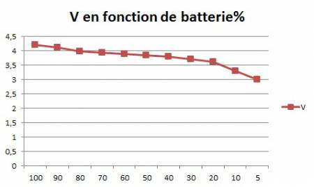 Nous avons constatés que lorsque la batterie est chargé à 100% elle délivre 4,17 V et, avec le temps, cette tension baisse.