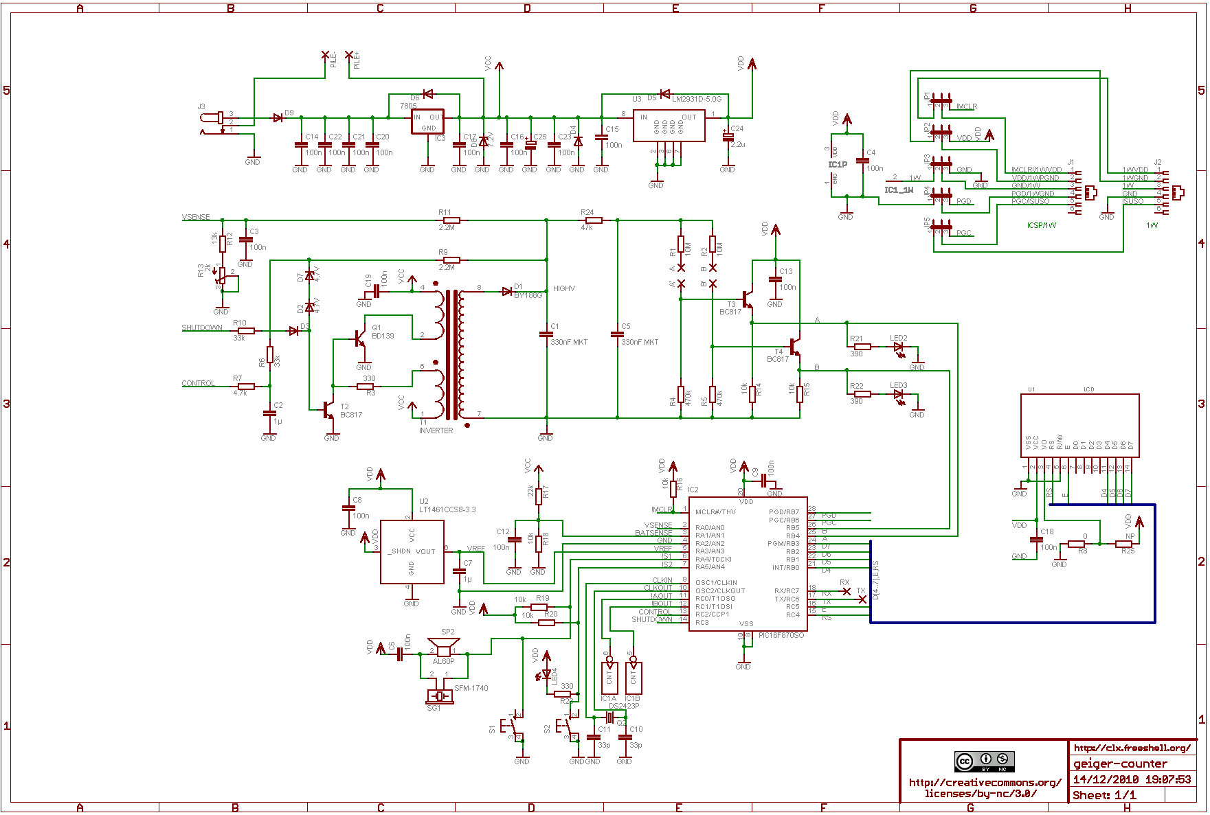 Le schéma de cLx (2) présente de très intéressantes fonctionnalités : régulation de la haute tension, contrôle logiciel de la coupure de l'alimentation du tube G-M, contrôle de la batterie. En outre les explications sont nombreuses, mais parfois un peu elliptiques pour moi !