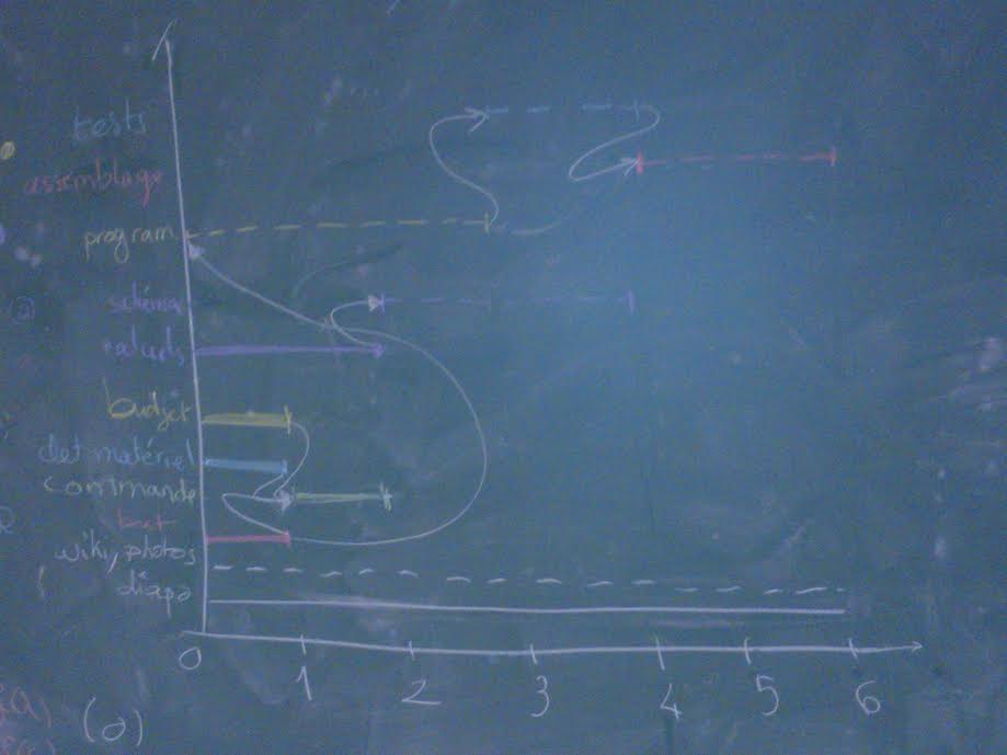 Séparation en deux groupes principaux : « Groupe Arduino » et « Groupe Spectrophotomètre » car nous avons conclu qu’il serait judicieux dans un premier temps de déterminer quel type de spectrophotomètre serait réalisable sans pour autant dépasser nos limites de fabrication (entre autre, le budget, le matériel déjà en disposition, la complexité de fabrication…), quel matériel est le plus adéquat en terme de coût et de qualité, et bien sûr expérimenter les différents matériels pour en assurer le fonctionnement et l’efficacité. Tel sera le rôle du Groupe Spectrophotomètre. Dans un second temps, nous serons nécessairement amenés à « traduire » les données reçues par les détecteurs et « commander » l’appareil pour ajuster les paramètres de mesure du spectrophotomètre en fonction de la mesure désirée. Dans cette optique intervient l’Arduino, lequel sera le cœur des travaux du groupe Arduino. Par ailleurs, ce dernier mettra également en place les propriétés physico-chimiques et les calculs qui régissent le fonctionnement du spectrophotomètre. Il est possible que chaque groupe se divise en plusieurs sous-groupes pour différentes tâches identifiées, mais la décision n’est pas encore prise.