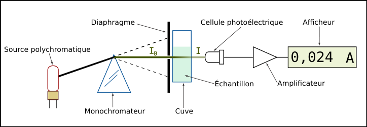 En spectrophotométrie, nous mesurons, grâce aux propriétés physico-chimiques, l'absorbance des échantillons (solutions, gaz…). Lorsqu'un rayon de lumière polychromatique comme la lumière blanche d'une ampoule traverse l'échantillon, celui-ci va absorber une partie des radiations et de ce fait résulte la couleur telle que nous l'observons à l’œil nu. Au sein du spectrophotomètre, où l'enceinte est isolée de toute source lumineuse indésirable, un faisceau de radiation traverse l'échantillon homogène. L'intensité du rayon émergent décroît exponentiellement lorsque l'épaisseur du milieu absorbant augmente. La Loi de Beer-Lambert nous permet donc de mesurer l'absorbance telle que :