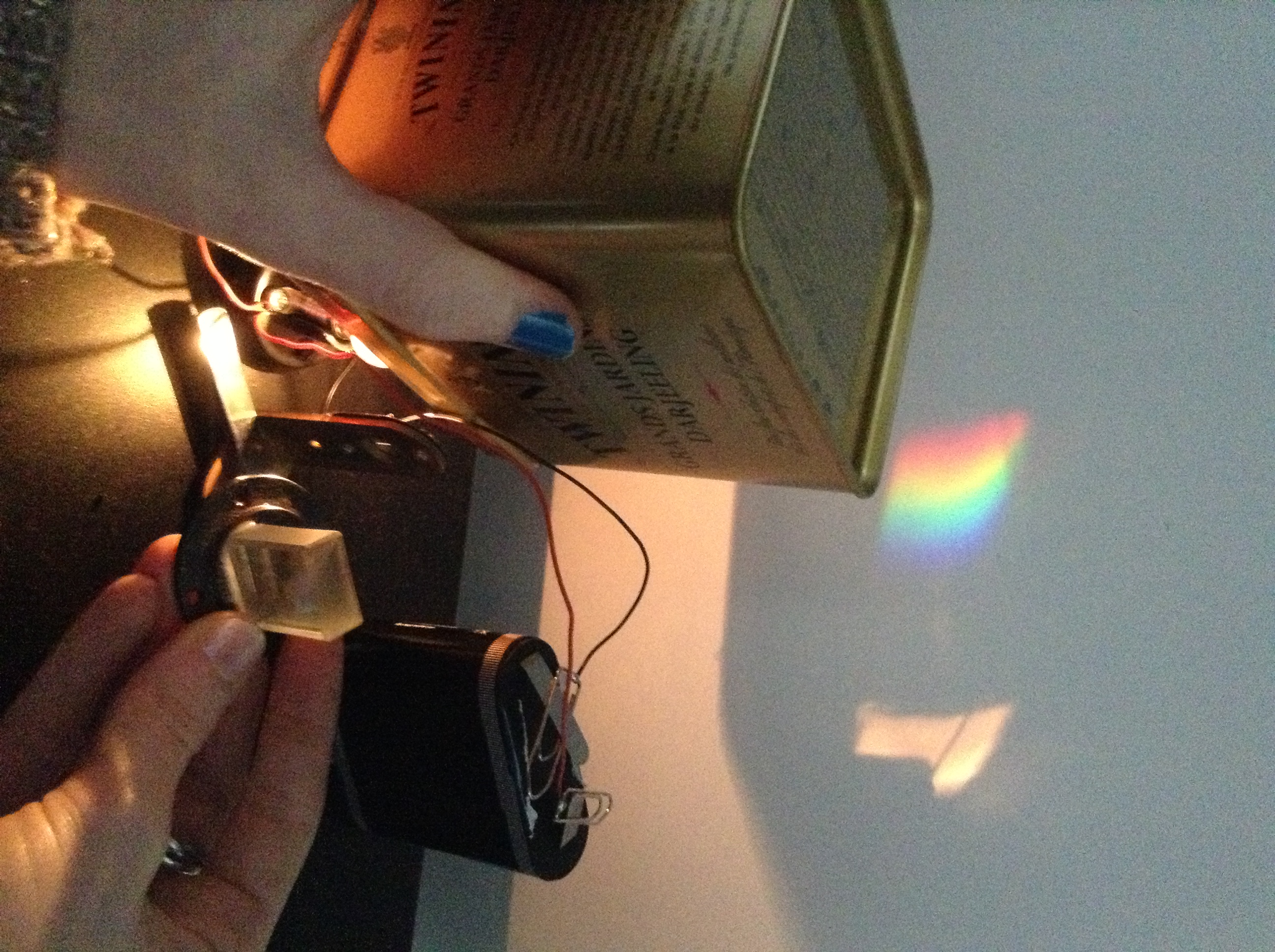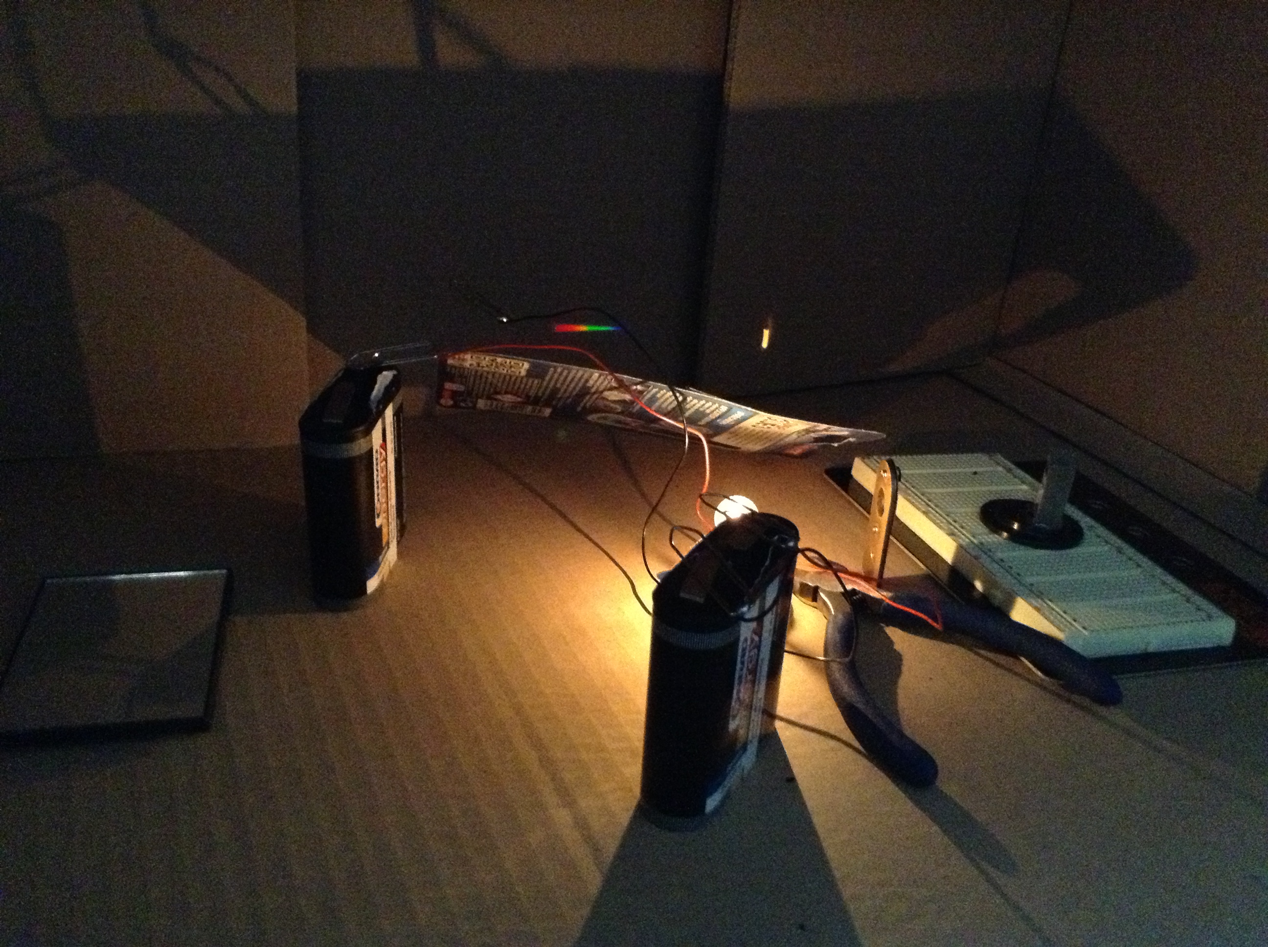 Nous avons réalisé au cours du deuxième bilan, une chambre noire faite en carton et une maquette, pour le moins rudimentaire, d'un spectrophotomètre. Nous avions récupéré en plus du réseau, deux fentes. La lumière a été diffracté avec succès mais ne ressort plus part la deuxième fente (et donc impossible de sélectionner une longueur d'onde). Voici des illustrations :