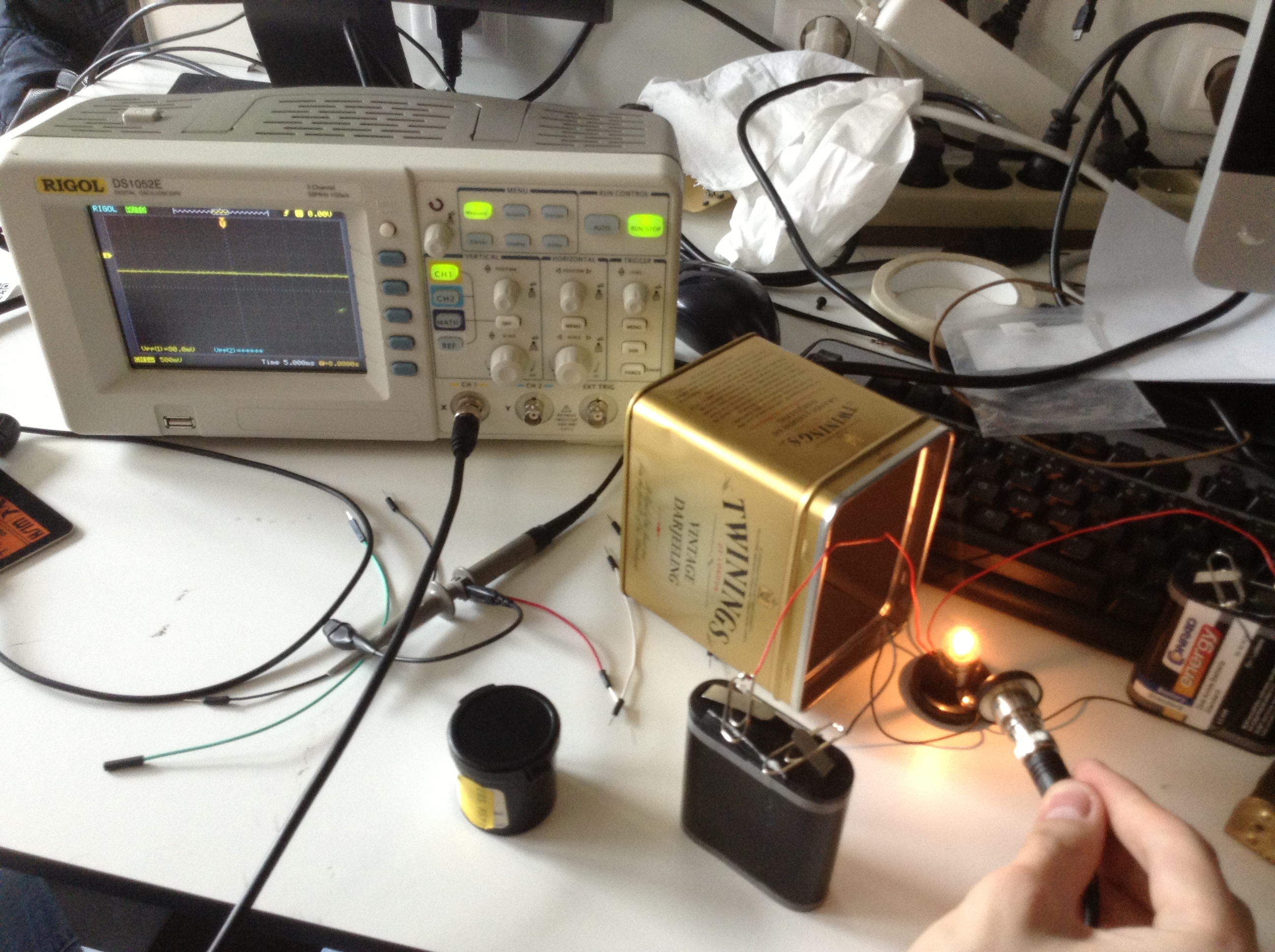 En fait, d'après la fiche descriptive du détecteur, nous mesurons avec l'inverse d'une tension. La tension lu sur l'oscilloscope diminuait lorsqu'on s'approchait d'une source lumineuse et augmentait lorsqu'on l'isolait dans le noir.