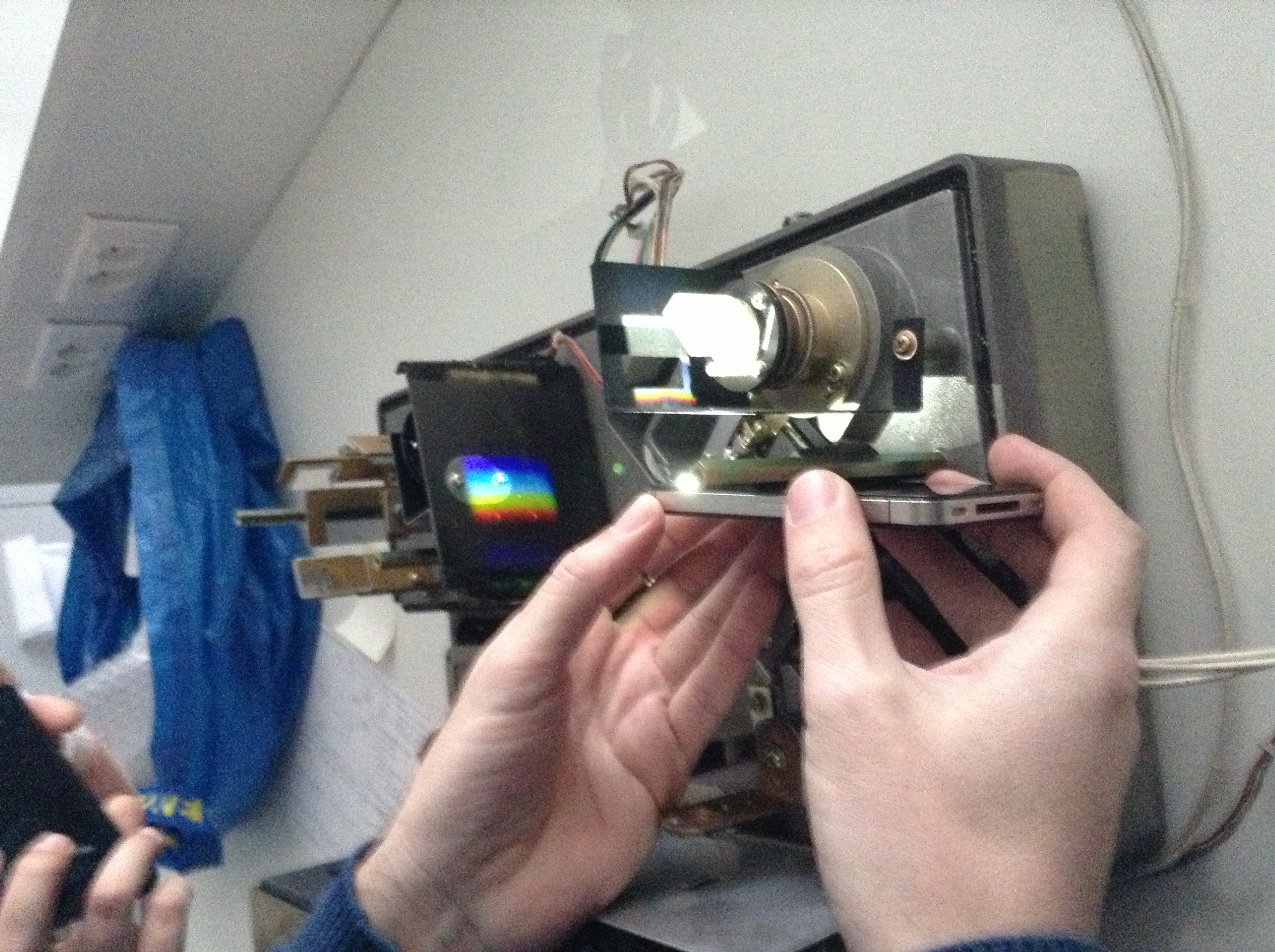 Il nous a présenté l'appareil sur lequel il travaille, un spectrophotomètre monofaisceau avec un disque tournant pour régler la longueur d'onde. Du fait que l'appareil fonctionne à un rayon lumineux unique, il doit “tirer” sur une partie du spectrophotomètre pour intervertir les cuvettes de mesure (échantillon et référence). A la différence d'un spectrophotomètre bifaisceau, comme il nous l'explique, c'est une manipulation faite manuellement tandis qu'avec deux rayons, la mesure de la référence est faite simultanément et aboutit à des résultats plus rapidement. Il nous a également parlé de la source lumineuse, dont le choix de la lampe varie selon l'intervalle de longueur d'onde dans laquelle nous souhaitons mesurer l'absorbance de nos échantillons. Le flash d'un appareil photo que nous avons utilisé pour tester le réseau de diffraction de l'ancien spectrophotomètre évoqué plus haut serait donc une source lumineuse peu fiable puisque le spectre de cette dernière peut présenter des différences importantes par rapport à une source lumineuse plus adéquate. Il utilise quant à lui, une lampe de tungstène.