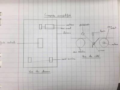 Je (Tristan) m'intéresse à présent à la forme (grossière) finale qu'aura notre profilomètre. En effet, ceci est nécessaire pour déterminer le positionnement du moteur. Pour commencer, j'avais tout d'abord pensé à un système en forme de “pont”. A partir de la, j'aurai fait translaté l'aiguille directement entre les 2 “pylônes” du châssis. Cependant, après avoir étudié cette solution , je me suis rendu compte qu'il faudrait également piloter le laser ainsi que la photodiode à la même vitesse que l'aiguille se déplaçant sur la surface. Cette solution n'étant à priori pas efficace, nous avons alors pensé à une autre solution. Il s'agit alors de déplacer non pas l'aiguille seule sur la surface étudiée mais de déplacer l'intégralité du système comme s'il s'agissait d'une voiture télécommandée. Pour cela nous avons pensé à utiliser un châssis plat en dessous du quel nous aurions placé 4 roues (roues du style roues de trottinette ou de rollers). Nous aurions alors placé un moteur sur le châssis et aurions piloté les roues avant par arduino en utilisant un système de tige filetée en guise de vis sans fin. Cependant pour obtenir une trajectoire bien rectiligne, il aurait probablement fallu utiliser un système de différentiel des roues. J'ai alors pensé à installer trois roues et non pas quatre sur notre système en plaçant une seule roue à l'avant que je motoriserai. J'ai alors été discuter avec Laurent Teixeira pour avoir son avis sur cette solution. Il m'a alors proposé de ne pas utiliser de vis sans fin mais de raccorder le moteur directement à la roue avant motrice, en positionnant le moteur sous le châssis. En effet la vitesse de translation finale souhaitée étant très faible, cette solution est bien adaptée. Cependant le moteur étant assez conséquent, il faudra donc dimensionner la hauteur du châssis ainsi que celle des roues en fonction de la taille du moteur. De plus, j'ai pensé à un problème de répartition des masses… En effet, le moteur possède une masse conséquente par rapport à celle de notre système finale, ainsi en le plaçant à l'avant de notre système, sur un des côtés du moteur, celui ci serait déséquilibré et risquerait de ne plus suivre une trajectoire bien rectiligne lors de sa mise en mouvement, ce qui nuirait ainsi considérablement à l’exploitation des données et donc à la précision de notre système. Il faudra donc placer une masse environ égale à celle du moteur à l'opposé du moteur, de manière à rendre notre système le plus homogène possible d'un point de vue massique. Je me suis alors procuré le matériel dont nous aurions besoin, à savoir un shield moteur arduino, un moteur “RS 5350401” ainsi que des roulements de manière à ce que les roues tournent en ayant le moins de frottements possibles. Ci-dessous les photos du matériel ainsi que de croquis du système.