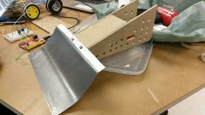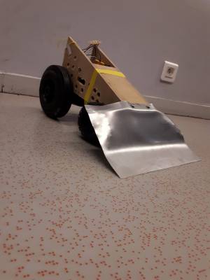 Pour cette partie du robot notre objectif était de mettre en place une rampe de sorte à pouvoir pousser plus efficacement les robots adverse, certes beaucoup d'autre robots disposaient du même concept et c'est pour ça que nous avons choisi d'utiliser une rampe en acier brut limée de sorte à ce qu'elle puisse toucher le sol et qu'ainsi nous puissions passer nous n'importe quel robot car en effet beaucoup de robot disposaient d'une rampe avec un gros écart entre le bas de la rampe et le sol laissant une grande faille pour le dispositif que nous avions prévu. Nous nous sommes donc procuré une plaque d'acier brut (50cm*25cm*0.75mm) dans un magasin de bricolage, nous l'avons ensuite coupée le plus possible de sorte à ne garder que la stricte minimum car la plaque pesait très lourd. Nous l'avons ensuite courbée, puis nous avons limé la partie qui devait être en contact avec le sol. Il ne restait plus qu'à percer deux trous de sorte à pouvoir fixer la rampe sur la partie supérieur du châssis.