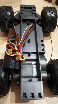 Première difficulté rencontrée : bien que le châssis soit parfaitement fonctionnel, il avait besoin d’une télécommande pour fonctionner, c’est-à-dire que nous ne pouvions absolument notre robot ainsi. Il nous a donc fallu court-circuiter la carte mère du châssis pour pouvoir y insérer notre propre alimentation directement entre l’interrupteur et le moteur (durant toutes les phases de test, nous avons utilisé une pile de 9V).