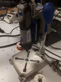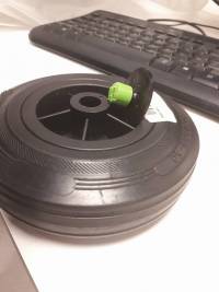 La prochaine étape était de pouvoir fixer les roues sur nos moteurs pour que notre robot puisse enfin rouler. Nous avions dès le début acheté des roues (au BHV), nous n’avions donc plus qu’à les visser sur les disques fournis avec les moteurs qui sont eux-mêmes faits pour se visser sur les moteurs. Ici, la difficulté était de faire en sorte que le centre de la roue soit bien au centre du disque pour que, une fois l’ensemble monté, les deux roues soient à la même hauteur avec le plus de précision possible. Pour cela, nous avons imprimé en 3D un gabarit qui se clipsait à la fois sur le disque et sur la roue et qui permettait de confondre leurs centres, si bien que le perçage devenait bien plus simple. Non seulement nous pouvions percer au bon endroit mais aussi percer les deux pièces en même temps pour s’assurer que les trous soient bien superposables. Pour le perçage, nous avons utilisé un dremel à colonne qui permet de faire des petits trous avec une bonne précision ; il présente l’avantage (du fait d’être monté sur colonne) de percer à coup sûr au bon endroit et ce de façon droite, condition qui nous était indispensable pour le perçage des roues.