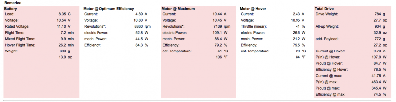 Étant donné que les composants n'avaient pas tous été choisis pour aller ensemble, nous avons tenus à vérifier la faisabilité du système et à évaluer les caractéristiques. Nous avons pour cela choisi xcoptercalc (http://www.ecalc.ch/xcoptercalc.php gratuit dans sa version limitée qui es suffisante, 1€ pour avoir accès à toutes les fonctions).