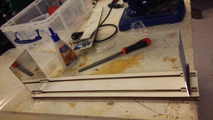 Nous avons décidé de ne pas faire une “boîte à miroirs” mais de faire des rails pour faire coulisser les miroirs dessus. Pour l'autre atelier, au lieu de faire une boîte verticale nous avons décidé de faire un plateau horizontal avec un cercle au lieu d'une simple courbe. Ainsi il suffit de remplir avec des plaquettes carrées plutôt que des cubes que nous trouvions contraignants.