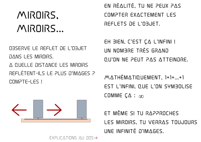 Le but étant de faire découvrir la notion d'infini à des collégiens, nous avons décidé de mettre en place 2 dispositifs sur un socle commun. L'un sera une sorte de boîte ouverte composée de miroirs faces à faces avec un objet au milieu (possiblement déplaçable par l'enfant) afin de le refléter “à l'infini”. Ceci permettrait de donner une image de l'infiniment grand. Notre 2e dispositif serait une sorte de contenant courbé sur un côté. Le but est de le remplir avec que des cubes, de sorte à montrer qu'on peut remplir des courbes avec une infinité de cubes, de plus en plus petits. Ici, on comprend la notion d'infinitésimal : l'infini peut aussi être “petit”.