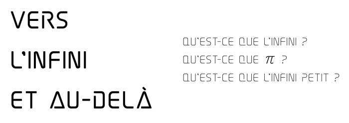 Nous avons personnellement choisi de traiter l’infini mathématiquement seulement (i.e. sans parler de planètes, atomes etc.), en explicitant infiniment grand et infiniment petit.
