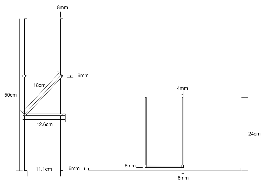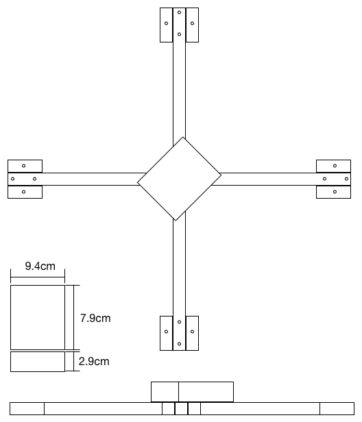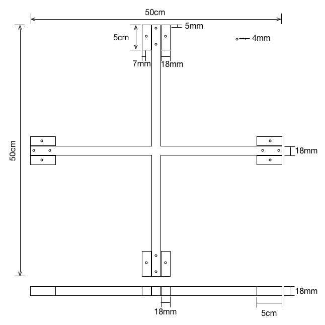 Le ch4ssis de base envisagé a la forme d'une croix ($+$) où chaque axe a une longueur de $50cm$, hauteur et largeur $18mm$. Cette forme est de simple construction. Le moins on attaque le bois avec des outils, le mieux il retiendra ses propriétés. Cette structure doit porter la majorité de l'abus des m0teurs, ainsi que le poids de la charge. Il est donc fondamental de garantir sa solidité. Version vectorielle