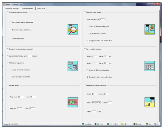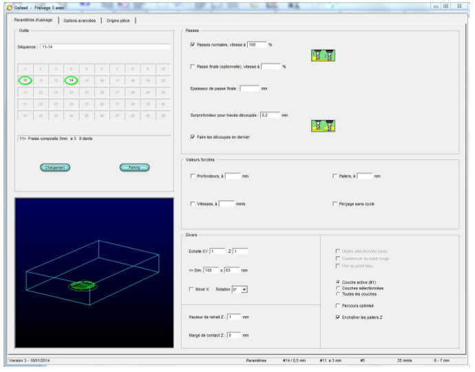 Outils: S'il y a plusieurs outils qui sera utilisé pour l'usinage on peut selectioné la séquence qu'on voudrais faire les opérations. En priori on n'aura jamais besoin la modifié. Il vous proposera la séquence que vous avez paramétré via Galaad (Countour/Hachure) OU la séquence que vous avez spécifie en Gcode si vous avez utilisé un autre logiciel pour écrit votre Gcode.