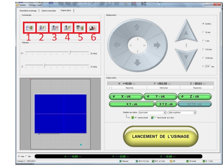 Appuyer sur “Deplacement a la position de changement d'outil”. La machine vas avancer jusqu'a la coins “Sud-Ouest” pour donné un bon access a la mandrin