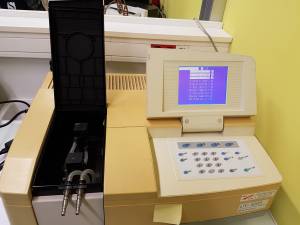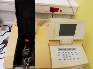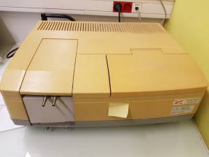 Spectrophotoètre UV-1605 SHIMADZU Sur la photo de droite, on peut voir le compartiment où on place notre cuve d'échantillon à analyser (celui du devant) et la référence est placé derrière. N.B: Il faut faire attention à l'emplacement des cuves et le sens du faisceau lumineux. (Suivre les flèches sur la machine)