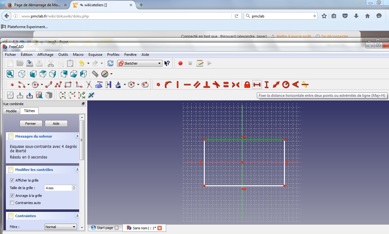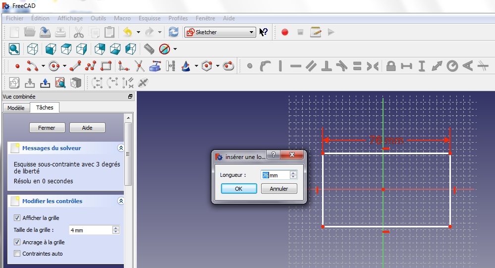 Sélectionner un coté du carré et fixer la distance horizontale entre deux points. Onglet en rouge en haut à droite. Ceci permet de définir précisément les dimensions de votre esquisse.