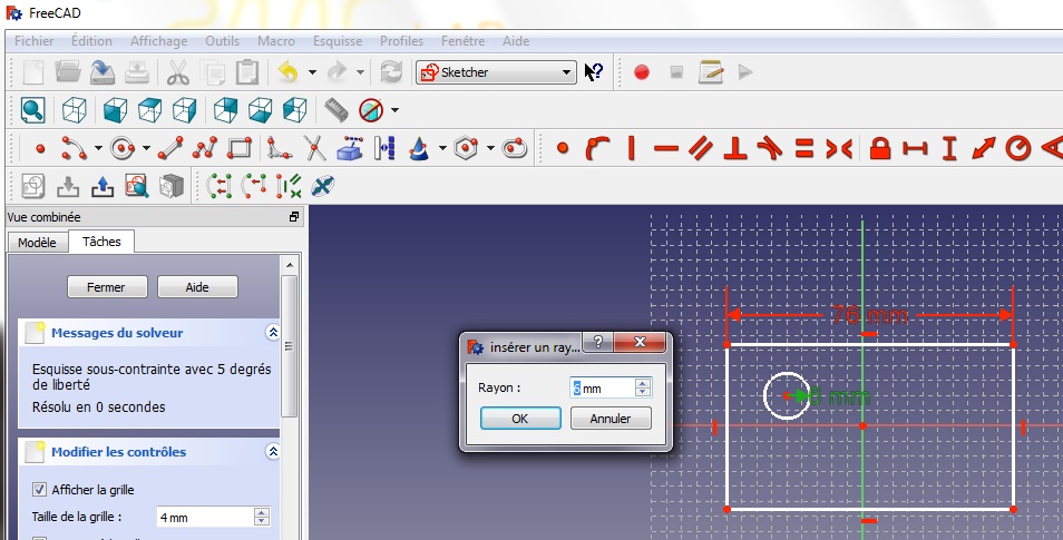 Bien entendu vous pouvez coter le rayon d'un cercle et l'ensemble de vos entités géométriques. Nous considérons l'esquisse comme terminer. Nous allons alors fermer l'édition de l'esquisse dans l'onglet tâches sur le bandeau à gauche de l'écran