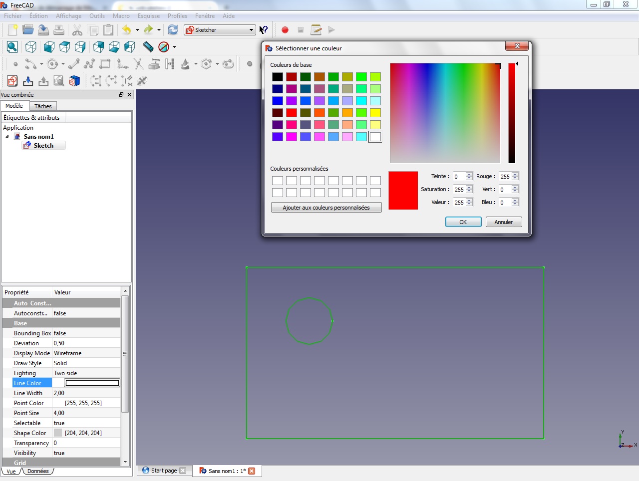 Afin de définir, l'esquisse en tant que trait de découpe pour le logiciel de découpe laser, on modifie la propriété couleur de l'esquisse en lui attribuant le rouge pur.