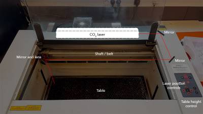 Elle est composée de trois parties principales : - Au dessus, la chambre constituée d'un plateau qui se déplace de haut en bas et d'un système optique constitué d'un miroir et d'une lentille permettant de diriger le faisceau sur le plan - En-dessous, le système de ventilation et de filtrage de l'air. - Derrière, le laser et son système de refroidissement. - L'unité qui se trouve à droite est un système de filtration de l'air complémentaire.